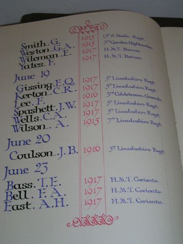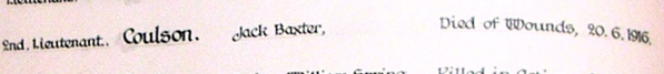 Jack Coulson is listed in the Lincolnshire Regiment Roll of Honour books located in Lincoln Cathedral. He is also commemorated on Cleethorpes M.H.F. School, St James’ Church, Grimsby war memorial, listed in a Roll of Honour Calendar book in the same church and remembered on a family grave in Lincolnshire.