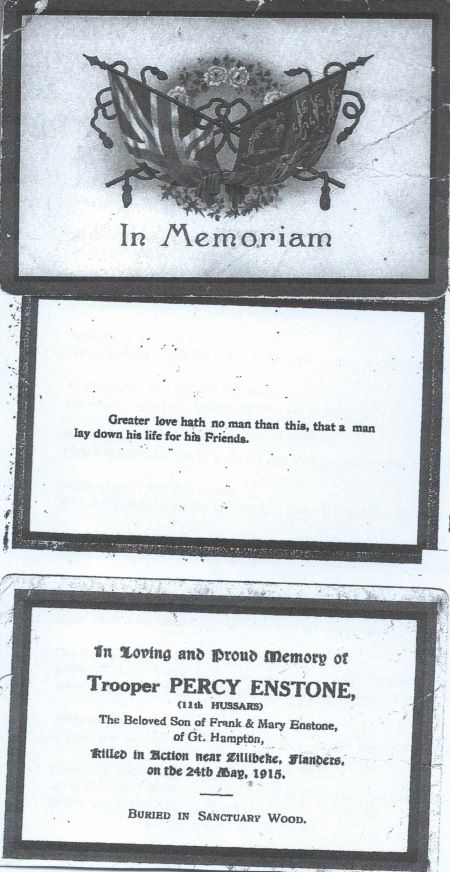 We regret to record the death of Trooper Percy Enstone, son of Frank Enstone, parish clerk of Hampton, who has been killed in action. The news of his death was conveyed to Trooper Enstone’s fiancee, Miss Ewins, of Briar-close, Evesham, by Sergt. King of his troop who found Miss Ewins’s address among his dead companion’s belongings. Trooper Enstone who was a very finely built man, stood six feet one inch in height and was well made in proportion. While living in Hampton, he was a member of the church choir and also a bell-ringer. He was a keen football player and for a time was captain of Evesham Wanderers’ club. He served for sixteen months in the Birmingham police force, of which his brother Frank is still a member. In September last Trooper Enstone enlisted in the 11th Hussars and left for France in October. He was wounded on November 16 in the eye and was an inmate of a Paris Hospital for five weeks, returning to duty about Christmas. He was shot and killed by a German sniper on White Monday (May 24) and was buried with all reverence in a small wood near the firing line. Sergt. King, in communicating the sad news to Miss Ewins, speaks in the highest terms of the way Trooper Enstone carried out his duties and states that he was in every way the true type of a British soldier. His death has caused much grief to his comrades with whom he was very popular. A muffled peal was rung on the church bells at Hampton on Sunday evening and feeling reference was made to Trooper Enstone’s death by the Rev. C.F. Thomas, who is acting as locum tenens for the new Vicar.