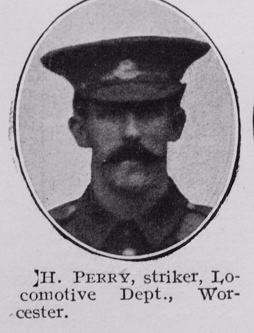 H. Perry, Striker/Locomotive and Carriage Dept/Worcester Age 38 Corporal 1st/8th Battalion Worcestershire Regiment, died 08/10/1918.